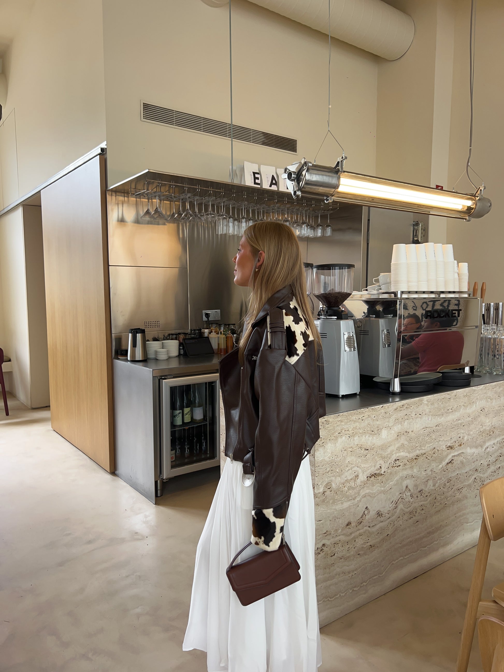Oversized short-cut jacket made of textured faux leather. Upper panel and cuffs in contrasting animal-print faux fur. Asymmetric front closure with metal zipper. Front zip pockets and flap pocket with snap button. Decorative shoulder tabs. Wide adjustable belt with metal buckle at the hem. Fully lined interior.